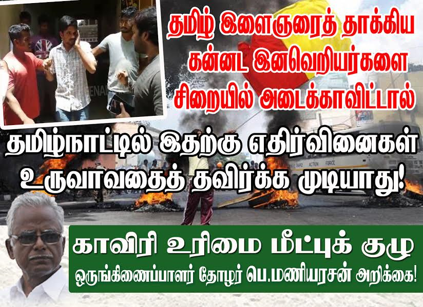 தமிழ் இளைஞர் கொடூரமாகத் தாக்கி இழிவுபடுத்தப்பட்டக் காட்சியை தொலைக்காட்சியிலும், சமூக வலைத்தளங்களிலும் பார்த்த இலட்சக்கணக்கானத் தமிழ்நாட்டு இளைஞர்கள் இரத்தம் கொதித்துப் போய் உள்ளார்கள். இது 1991 திசம்பர் அல்ல! 2016 செப்டம்பர் என்பதை கன்னட இனவெறியர்களுக்கு எச்சரிக்கையாக சொல்லிக் கொள்கிறேன்.